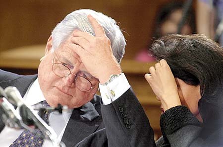 상원 법사위원회 소속인 에드워드 케네디 의원이 지난달 30일 존 애시크로프트 법무장관 지명자의 인준 표결에 앞서 자신의 보좌관과 함께 귀엣말을 나누고 있다. 「워싱턴 AP연합」