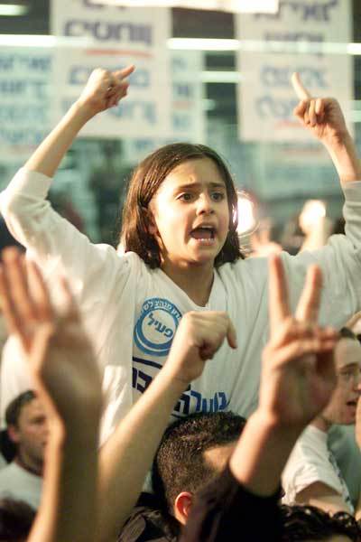 7일 이스라엘 리쿠드 당 지도자 샤론의 승리가 확실시 되자 한 소녀가 환호를 보내고 있다. 이번 총선에서 장군 출신의 강경파 지도자 샤론은 이스라엘-팔레스타인 유혈폭동에 휘말려 평화협상에 실패한 전 수장 에후드 바라크에 전국에 걸쳐 승리했다. 「AP」