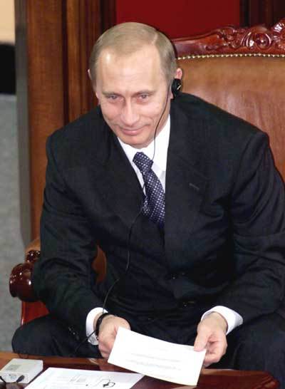 28일 한국을 방문중인 푸틴 러시아 대통령이 국회연설에 앞서 이만섭 국회의장의 소개인사를 듣고 미소를 짓고 있다. 「AP」