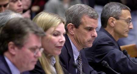 빌 클린턴 전 미국 대통령의 핵심 측근들이 1일 미 하원 정부개혁위원회에서 자신들은 금융재벌 마크 리치에 대한 사면에 반대했었다고 증언하고 있다. 오른쪽부터 존 포데스타 전 백악관 비서실장, 브루스 린지 전 백악관 보좌관, 베스 놀런 전 백악관 고문, 잭 퀸 전 백악관 고문.「워싱턴 AP연합」