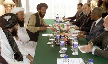 코피 아난 유엔 사무총장(오른쪽)이 11일 파키스탄 이슬라마바드에서 와킬 아흐메드 무타와킬 아프가니스탄 외무장관(왼쪽에서 두번째)을 만나 불상 파괴 사태에 대한 우려의 뜻을 전달하고 있다. 그러나 무타와킬 장관은 불상파괴령을 철회할 수 없다고 밝혔다.「이슬라마바드 AP 연합」