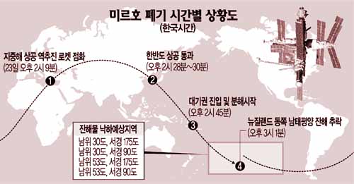 당초 계획되로 추락작업이 진행되면 미르호는 이날 뉴질랜드와 칠레 사이의 남태평상에 떨어지게 된다.