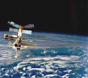 사진은 1996년 미국의 우주왕복선 애틀랜티스호에서 바라본 러시아의 우주정거장 미르호 |
