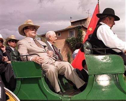 아르헨티나를 공식 방문중인 장쩌민 중국 국가주석(왼쪽)이 8일 부에노스아이레스 외곽의 한 목장을 방문해 마차를 탄 채 느긋한 표정을 짓고 있다. 「부에노스아이레스 AP 연합」