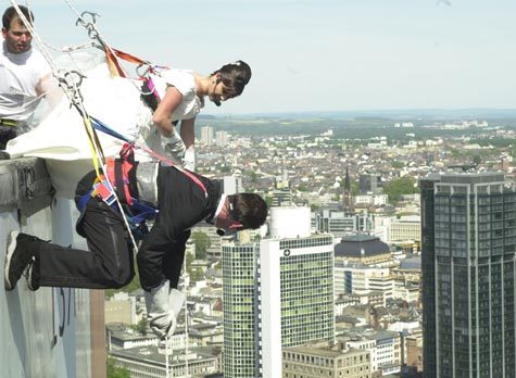 지난 주말 독일에서 열린 마천루 페스티발에서 한 신랑신부가 141m 높이의 프랑크푸르트 오피스센터 건물 꼭대기에서 줄을 타고 내려갈 준비를 하고 있다. 프랑크푸르트의 고층 건물들은 토·일요일에 일반에게 개방된다. 「AP」