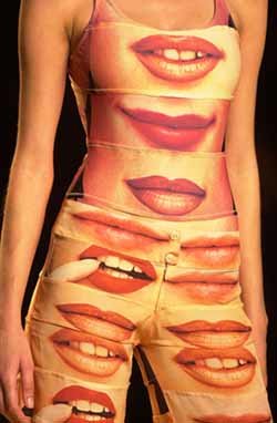 3일 브라질 상 파울로에서 열린 2002 봄-여름 비치컬렉션 패션쇼에서 한 모델이 입술 모양으로 한껏 멋을 낸 옷을 선보이고 있다.[AP]