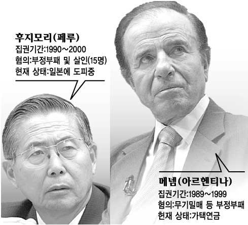 인종과 종교가 다르다는 이유로 수많은 민간인을 학살한 슬로보단 밀로셰비치 전 유고연방 대통령이 국제전범재판소 법정에 선 데 이어 카를로스 메넴 아르헨티나 전 대통령이 4일 기소됐다. 페루 정부는 일본에 망명한 알베르토 후지모리 전 대통령을 처벌하기 위해 귀국시키려고 집중적인 노력을 하고 있다.