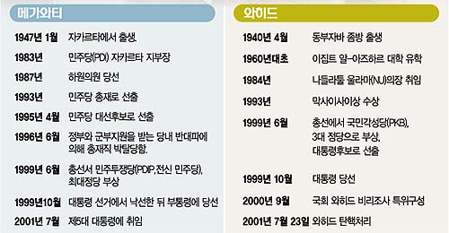 메가와티 수카르노푸트리 신임 인도네시아 대통령(54)에게는 ‘국부(國父) 수카르노의 딸’이라는 호칭이 꼬리표처럼 따라다닌다. 인도네시아의 독립 운동을 이끈 뒤 초대 대통령에 취임한 수카르노가 바로 그의 아버지이기 때문. ‘수카르노푸트리’라는 말도 ‘수카르노의 딸’이라는 뜻이다. 이제 반세기 만에 아버지의 뒤를 이어 그 딸이 혼란의 인도네시아를 이끌게 됐다.