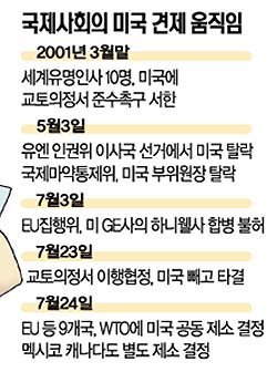 이러한 움직임은 유럽연합(EU)과 러시아 일본 등이 최근 미국을 배제한 채 온실가스 감축을 위한 교토의정서의 이행 협정을 타결한 데 이어 24일 EU와 브라질 태국 한국 등 9개국이 세계무역기구(WTO)에 미국의 반덤핑 관세정책을 제소키로 결정하면서 가시화되고 있다.