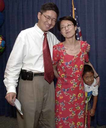 대만을 위한 간첩 혐의로 기소돼 중국 법원으로부터 10년형을 선고받은 뒤 미국으로 추방된 중국계 미국 영주권자인 가오잔 아메리칸대 사회학 교수(오른쪽)가 26일 버지니아주 둘스 공항에 도착해 남편 아들과 함께 기자회견장에 들어서고 있다. <샨틸리(버지니아)AP연합>