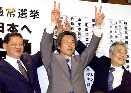 고이즈미 준이치로 일본 총리(가운데)가 29일 참의원 선거에서 압승을 거두자 V자를 그려보이며 승리를 자축하고 있다.「도쿄=AP연합」