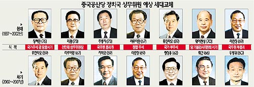내년 가을 당 대회에서 퇴진하는 사람은 장 주석, 리펑 위원장, 주룽지(朱鎔基) 총리, 웨이젠싱(尉建行) 당 기율검사위원회 서기. 이들 대신 원자바오 부총리, 쩡칭훙(曾慶紅) 당조직부장, 뤄간(羅幹) 국무위원, 우방궈(吳邦國) 부총리가 정치국 상무위원회에 새로 진입한다.