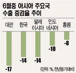 이처럼 아시아 국가들이 경기하락에 시달리는 것은 전통적으로 성장의 엔진으로 삼아왔던 수출이 부진을 면치 못하고 있기 때문. 아시아 국가들의 6월 중 수출은 작년 6월에 비해 대만이 -17%, 한국 말레이시아 인도네시아 홍콩 등도 -8∼-14%의 감소세였다.