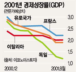 유로화 사용 국가의 산업생산도 올 1·4분기 0.3%에 이어 2·4분기에도 0.9%가 각각 감소하는 등 2분기 연속 하락세에서 벗어나지 못했다. 이코노미스트는 “당초 2.9%로 예상됐던 유로화 국가의 경제성장률을 1.9%로 하향 조정하는 것이 불가피해졌다”며 “미국 경제와 맞물려 유럽 경제의 침체가 당분간 지속될 것”이라고 전망했다.