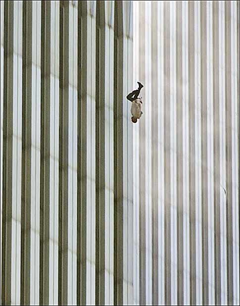 세계무역센터 북쪽 건물에 있던 한 사람이 11일 첫번째 폭발 후 화염을 피하기 위해 뛰어내리고 있다.<뉴욕AP연합>