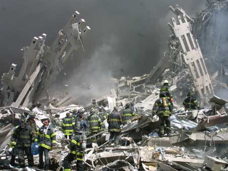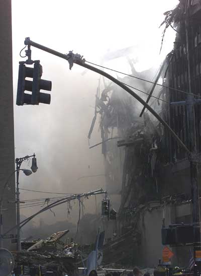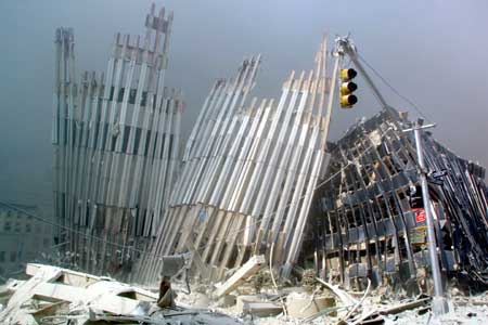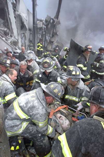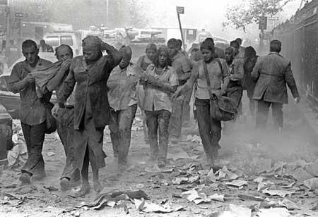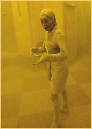 먼지를 잔뜩 뒤집어 쓴채 사고현장 인근건물로 피신한 이 여성은 흑인일까 백인일까 아니면 황인종 일까. 대재앙 앞에 인종구별은 무의미하다는 것을 이 사진은 보여주는 듯 하다.