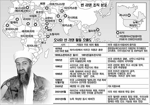96년 사우디의 다란 미군기지가 폭파되자 미국은 수단 정부에 테러 배후로 지목된 빈 라덴을 넘기도록 압력을 가했고 수단측은 국외추방의 방법을 택했다. 이슬람 과격파 무장단체 탈레반이 집권하고 있던 아프간은 유일하게 남겨진 도피처나 마찬가지였다. 테러지원은 계속됐으며 비록 미수에 그쳤지만 빈 라덴은 지구촌이 밀레니엄 축제에 빠져있던 1999년 12월31일 미국 로스앤젤레스국제공항을 파괴하려 했던 것으로 알려졌다.