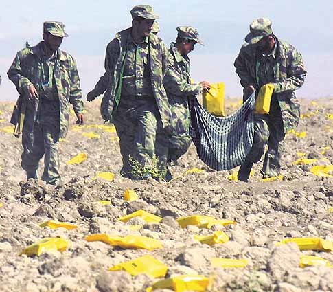 탈레반과 치열한 전투를 벌이고 있는 아프가니스탄 북부동맹 군인들이 북서부 카와자 바후딘 지역에서 13일 미국이 제공한 구호식량을 운반하고 있다. 미국은 12, 13일 이틀에 걸쳐 수 톤의 구호식량을 아프가니스탄 북부 지역에 비행기로 투하했다><카와자바후딘(아프가니스탄 북부 AFP연합>