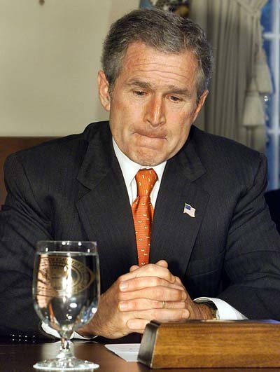 조지 W 부시 미국 대통령이 23일 백악관 우편물 취급소에서 탄저균이 검출된 직후 백악관에서 가진 기자회견에서 탄저균 검사를 받았느냐는 기자들의 질문에 곤혹스러워 하고 있다. 부시 대통령은 이같은 질문에 확인을 거부하고 자신은 탄저균에 감염되지 않았다고만 밝혔다.<워싱턴AFP연합>
