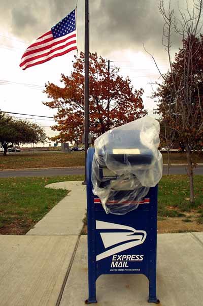 “우체통까지 봉쇄하라” 미국에서 탄저균 확산이 다시 우려되고 있는 가운데 25일(현지시각) 미국 뉴저지주 해밀턴 소재 트렌튼 우체국 인근의 속달 우체통이 당국의 비상초치에 따라 입구가 봉쇄됐다.<해밀턴AFP연합>