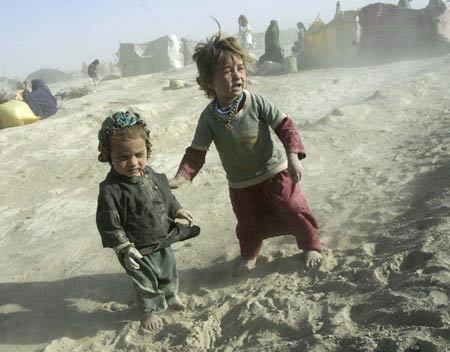 아프간 난민촌의 어린이들이 흙먼지 속에서 놀고있다. [AP]