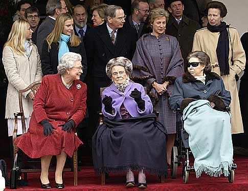 12일 런던 캔싱턴궁에서 엘리자베스 영국 여왕(앞줄 맨 왼쪽)의 아주머니인 앨리스공주(앞줄 가운데)의 100세 생일을 앞두고 왕실 가족들이 모처럼 한 자리에 모였다. 앞줄 맨 오른 쪽이 마가렛 공주이고 뒷줄 오른쪽부터 로얄 공주,글라우세스터 공작 부처와 그의 두 딸.<런던AFP연합>