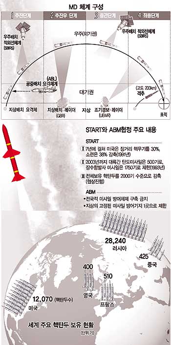 조지 W 부시 미 대통령이 취임 후 추진해 온 것으로 적의 미사일을 지상, 해상, 공중에서 요격하는 방어전략. 로널드 레이건 행정부 때 ‘스타워스’로 불렸던 MD 체제가 기원이다. 차이가 있다면 당시에는 주로 소련의 핵미사일 공격에 대비하기 위한 것이었지만, MD는 생화학 또는 핵무기 등 대량살상 무기를 쓸 가능성이 있는 이른바 ‘불량국가’의 소규모 공격에 대비하기 위한 것. 또 미국은 우방국들의 비판을 무마하기 위해 자국 방어를 포함해 우방국까지 방어할 수 있는 전(全) 지구적 방어 체제 구축을 추구하고 있다.