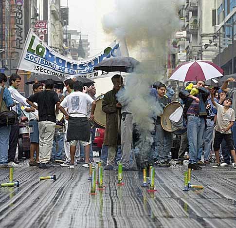 아르헨티나 은행원들이 13일(현지시각) 중심가인 부에노스 아이레스에서 정부의 초긴축 정책에 항의, 가두시위를 펼치고 있다.