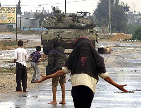 팔레스타인 소년들이 15일 가자지구 북쪽의 베이트 하눈에서 이스라엘군 탱크에 돌을 던지고 갈 길을 막고 있다.<베이트하눈AP연합>