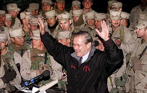 도널드 럼즈펠드 미 국방장관이 16일 아프간의 바그람 비행기지에서 미 제 10 산악사단소속 부대원들과 간담회를 가진뒤 장병들의 환호에 답하고 있다.<아프간AP연합>
