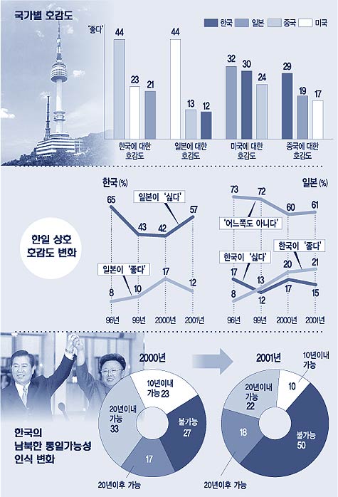 미국의 대테러 전쟁 지원을 위한 일본 자위대의 해외파병에 대해서는 한중 양국에서 우려의 목소리가 높았다. 한국인의 55%, 중국인의 82%가 자위대 파병을 위한 법률 제정을 ‘잘못한 일’이라고 평가했고, 한국인의 57%와 중국인의 61%는 자위대의 해외파병에 불안감을 느낀다고 답했다.