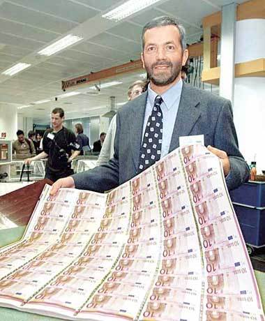 내년 1월1일부터 통용될 유로화를 디자인한 화폐 디자이너가 막 인쇄된 유로화 지폐묶음을 선보이고 있다 「빈(오스트리아)AP연합」
