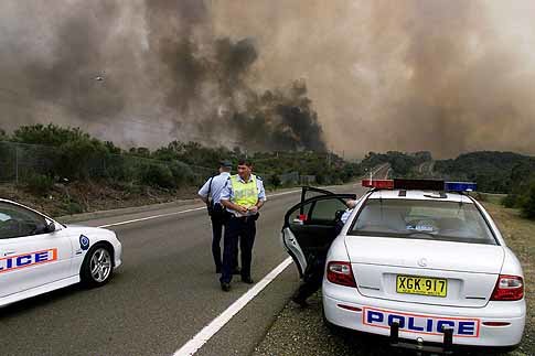 호주 동부 뉴사우스웨일스주의 삼림지대에서 시작돼 시드니 외곽까지 산불이 번지고 있는 가운데 경찰관들이 검은 연기로 가득한 시드니 외곽도로를 통제하고 있다. <시드니(호주)로이터특약>