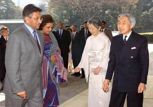 아키히토 일본 천황 내외(오른쪽)가 14일 도쿄의 황궁에 도착한 페르베즈 무샤라프 파키스탄 대통령 내외를 반갑게 맞고 있다. 무샤라프 대통령은 4일 동안 일본의 정치 경제계 지도자들을 만나 경제지원을 요청할 예정이다. 도쿄AP연합