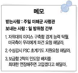 이 메모에는 미군 측에 △‘이지스함은 경계감시능력이 뛰어나 미 해군과 상호운용을 강화할 수 있으므로 파견을 기대한다’ △‘수색구난 분야에서 고도의 수상(水上)감시능력을 갖추고 있는 해상자위대의 P3C 초계기의 지원을 기대한다. 디에고 가르시아섬 부근에 와준다면 좋겠다’ △‘해상자위대 보급함 2척의 인도양 배치를 최대한 연장해 주면 고맙겠다’고 요청하는 내용이 들어있다.