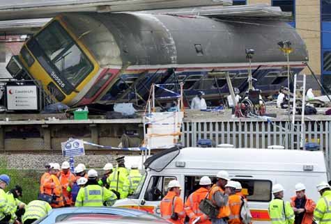 영국 사고조사관들이 11일 런던 북쪽 하트퍼드셔 포터스바역에서 열차 탈선사고 현장을 살피고 있다. 10일 낮 151명의 승객을 태운 통근열차가 탈선, 포터스바역 승강장에 부딪히면서 7명이 사망하고 80여명이 다쳤다.