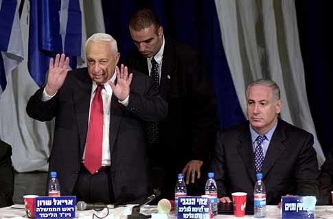 아리엘 샤론 이스라엘 총리(왼쪽)가 12일 텔아비브에서 열린 리쿠드당 중앙위원회에서 베냐민 네타냐후 전 총리(오른쪽)가 발의한 ‘팔레스타인 독립국 반대 결의안’을 통과시켜서는 안된다며 두손을 펴보이고 있다.텔아비브AP연합