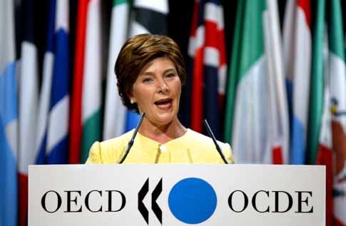 로라 부시 미국 대통령 부인이 백악관 입성 이후 처음으로 나선 유럽 단독 순방의 첫 기착지인 프랑스 파리에서 14일 경제협력개발기구(OECD) 포럼 참석자들에게 어린이 교육의 중요성에 대해 연설하고 있다. 파리AP연합