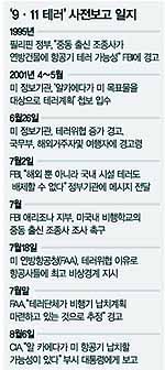 이에 앞서 NBC방송은 9·11 테러가 발생하기 불과 이틀전인 지난해 9월9일 부시 대통령의 집무실에 알 카에다 조직 분쇄를 위한 ‘국가안보 대통령 작전명령’이 올라왔으나 그는 테러가 발생할 때까지 이 계획에 서명하지 않았다고 보도, 파문이 확산되고 있다.