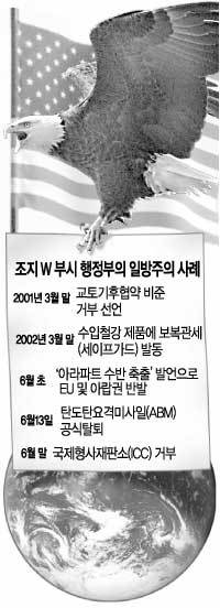 이 같은 힘을 토대로 부시 대통령은 온실가스 배출에 관한 교토의정서 등 주요 국제협약에 반대해 왔다. 그의 이 같은 태도는 비생산적일 수 있다. 역대 정권은 비록 막후에선 힘을 사용하더라도 공개적으론 동맹국과 협의하거나 유엔 등 국제기구 내에서 문제를 해결하려 했다.