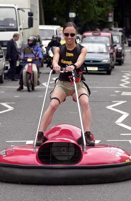 유명 게임 캐릭터 라라 크로프트의 의상을 입은 한 영국 여성이 11일 수륙양용 호버크래프트를 타고 런던 중심가를 질주하고 있다. 아래로 고압공기를 분사하는 방식으로 물이나 땅 위를 뜬 채 움직여 ‘에어보드’로도 불리는 이 호버크래프트는 영국에 단 두 대 뿐이다.