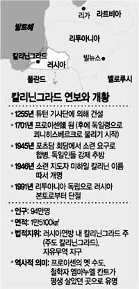 발트해(海) 연안의 러시아 역외영토인 칼리닌그라드의 운명이 러시아와 유럽 간 최대 현안으로 떠오르고 있다. 러시아 본토와의 사이에 있는 폴란드와 리투아니아의 2004년 유럽연합(EU) 가입으로 칼리닌그라드의 고립상황이 더욱 심해질 가능성이 커진데다 주민들 사이에서 독일로 복귀하자는 움직임까지 일고 있기 때문.