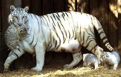18일 아르헨티나의 부에노스 아이레스 동물원에서 희귀종 흰 털 호랑이 베티가 생후 40일 된 새끼 호랑이 세마리와 오붓한 시간을 보내고 있다. 베티의 순산으로 전세계 백호는 207마리로 늘었다. 부에노스 아이레스AFP연합