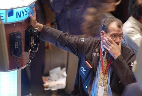 미국 증시가 지난주말에 이어 22일 또다시 폭락하자 뉴욕증권거래소(NYSE)의 한 거래인이 허탈한 표정을 짓고 있다. 월드컴 파산신청 등으로 인해 이날 다우지수는 7,784까지 떨어졌는데 다우지수가 8,000선 이하로 떨어진 것은 98년 이후 처음이다.