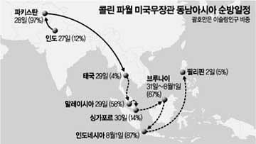 파월 장관은 순방 직전 워싱턴에서 가진 기자회견에서 “어떤 국가도 알 카에다 세력에 우호적인 환경을 제공해서는 안 된다”며 “그런 환경을 최대한 이용하려 할 알 카에다는 해당 국가에 해가 될 것”이라고 경고했다.