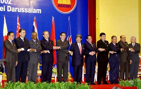29일 브루나이 수도 반다르세리베가완에서 열린 아세안지역안보포럼(ARF) 연례 외무장관회의 개막식에서 각국 대표들이 서로 손을 잡고 있다. 왼쪽부터 윈 아웅(미얀마) 도밍고 시아존(필리핀) 순무감 자야쿠마르(싱가포르) 닛 피불송크람(태국) 응옌 디 니엔(베트남) 모하메드 볼키아(브루나이) 호르 남홍(캄보디아) 핫산 위라주다(인도네시아) 섬사왓 렝사밧(라오스) 시에드 하미드 알바르 대표(말레이시아)와 로돌포 세베리노 ARF 사무총장.