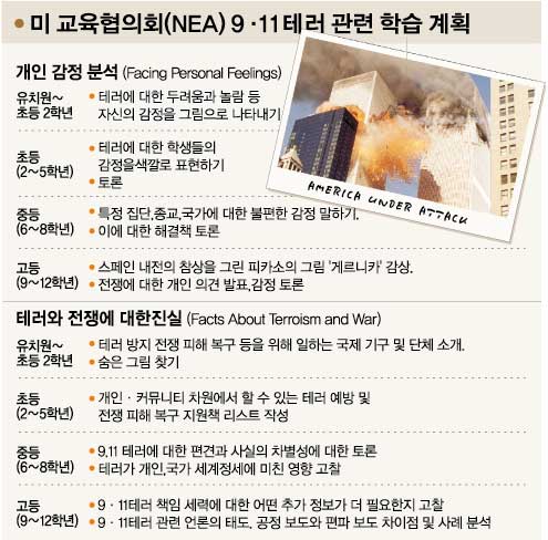 NEA 공식사이트(www.nea.org)를 통해 공개된 학습계획서는 유치원∼고교 3학년생을 대상으로 △개인 감정 분석 △테러와 전쟁에 대한 진실 △대안 모색 △관련 행사 및 언론 보도 △추천 도서 및 음악 등 5개 분야를 다루고 있다.