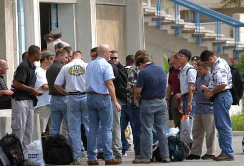 한국전쟁 당시 실종된 미군유해발굴 작업을 벌일 미군 2차 유해발굴단이 24일 평양의 순안공항에 도착해 탑승할 차량을 기다리고 있다.