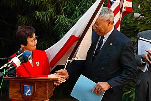 콜린 파월 미국무장관이 4일 요하네스버그 ‘지속가능한 발전을 위한 세계정상회의’에서 가와구치 요리코 일본외상과 악수하던 중 일장기가 넘어져 부딪치고 있다. 앞서 환경단체 대표들이 파월 장관의 연설 도중 야유와 구호를 외쳐 연설이 잠시 중단되기도 했다. 열흘간의 일정을 마치고 이날 폐막된 정상회의에서 각국 대표는 빈민 감축 등에 관한 공동 합의문과 이행 계획 등을 채택했다. 요하네스버그(남아공)AP연합