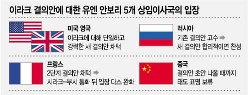 ▽러시아와 프랑스의 입장 완화〓유리 페도토프 러시아 외무차관은 9일 “새 결의안이 기존 결의안에 기초를 두고 이라크가 받아들일 수 없는 요구나 (미국의) 자동 무력 사용 조항이 포함되지 않을 경우 받아들일 수 있다”고 밝혔다. 앞서 이고리 이바노프 외무장관도 “새 결의안이 대이라크 무기사찰의 효율성을 높이기 위한 것이라면 지지할 준비가 돼 있다”고 말한 바 있다.